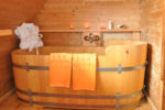 - 2 Badezimmer mit Waschbecken und WC (1 x mit Holzbadewanne und 1 x mit Dusche)